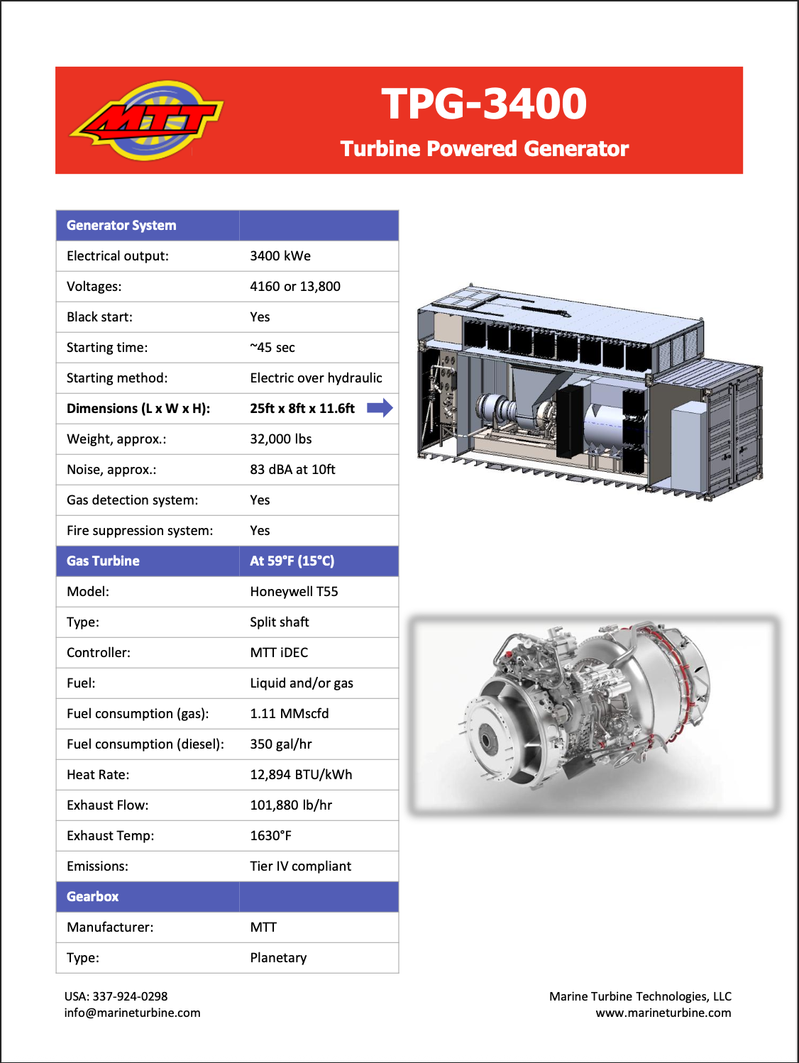 MTT is thrilled to announce the launch of our latest innovation, the 3.4 MW TPG-3400 Turbine Powered Generator. Building on the success of our 250 kW TPG-250 and 1 MW TPG-1000 models, the TPG-3400 sets a new standard in power generation.
