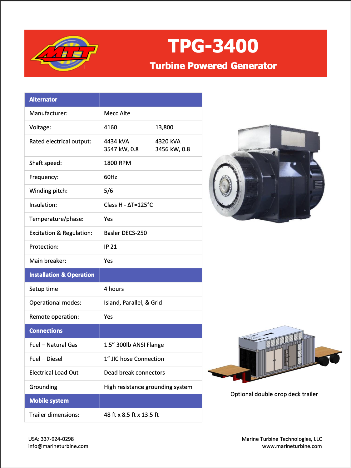Whether you need mobile, remote or fixed based power for AI, Crypto Mining, Industrial Operations or Emergency Backup, the TPG-3400 is your go-to solution. Join us in embracing the future of power generation with Marine Turbine Technologies!