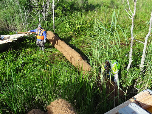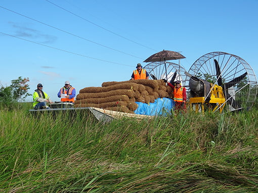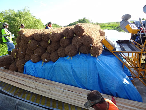 MTT was contracted to transport and install several hundred bundles of retention material made from the innovative use of coconut husks.  These 10 foot long by one foot diameter bundles are laid across the canals created by the tracks of the marsh buggies.  The bundles are held in place with 20 foot sections of 2 by 2 inch pine stakes.  This allows the tidal flow to access the damaged areas.  When the tide recedes the sediment is retained which builds up the land and allows the vegetation to take root.