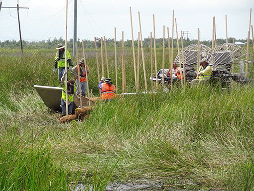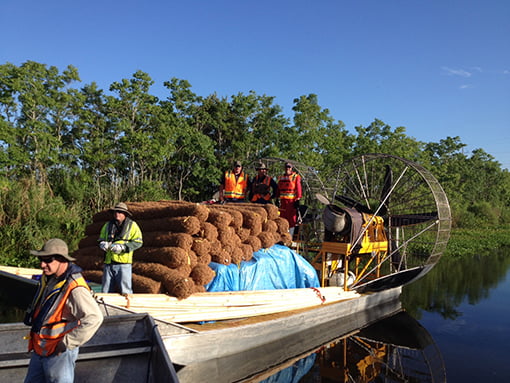 Case Study 2: – Remediation of Marsh Buggy Damage to Wetlands – Jean Lafitte Project – Coconut Husk and Pine Stake Remediation Materials – MTT Super Turbine Airboat – www.marineturbine.com