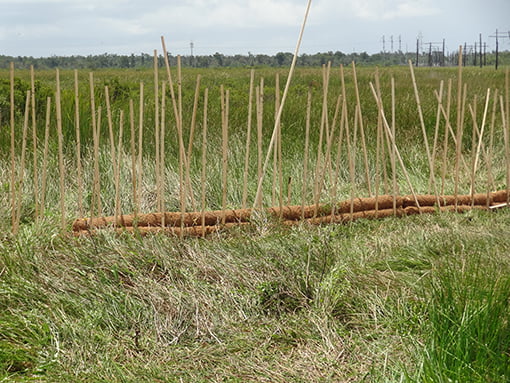 Case Study 2: – Remediation of Marsh Buggy Damage to Wetlands – Jean Lafitte Project – Coconut Husk and Pine Stake Remediation Materials On Site – MTT Super Turbine Airboat – www.marineturbine.com