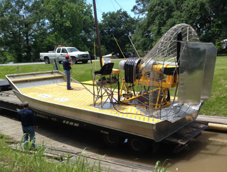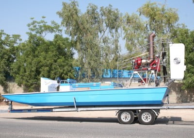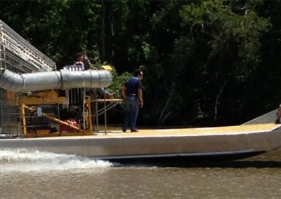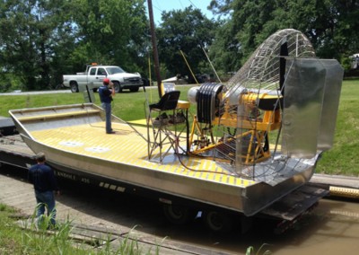 MTT designs custom airboats which are used for inland waterways. All airboats have forward, neutral and reverse. The powerplant can be a 420 to 4,000 HP engine in a single or dual arrangement. Boat sizes range from 17 – 45 feet or greater. Applications are designed for plug and abandon work, pipeline work, remediation or any use that requires sensitivity to marshlands and difficult water access. Retractable landing gear is available for road transport.