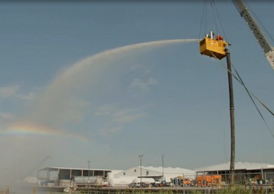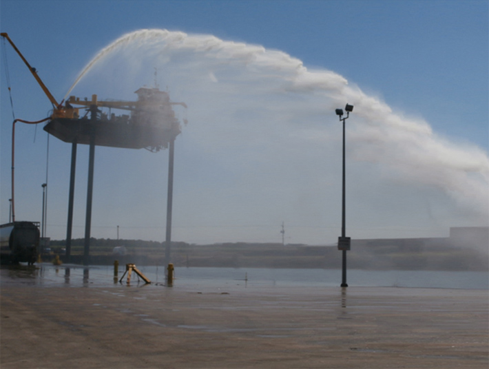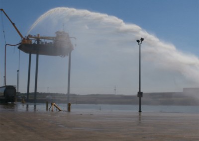 The advantage of having a FiFi system at the highest point on a platform solves the problem of contracting for an expensive OSV to hold station for days on end. With the FiFi Rig Pack system the platform can supply its own water curtain on its own schedule and during emergencies. The Rig Pack is also portable and can be moved to another platform or a ship.