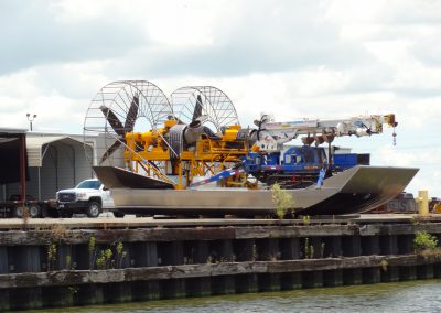 MTT 16 x 45′ Twin Turbine Super Airboat. Twin 1,500 HP T-53 Honeywell turbine engines on diesel fuel with 10 foot diameter / 5 blade carbon fiber props. Multi-fuel capable which includes lower volatility fuels such as No. 2 diesel and kerosene. Dry weight: 17,660 lbs. Wet weight with fuel: 22,000 lbs. Single point lifting harness. In water the deck load capacity is 80,000 lbs. The boat is capable of transporting 12,000 lbs. of payload over dry ground or green marsh with no environmental impact. In marsh it is variable but not limited to 12,000 lbs. Welded aluminum hull. Completely decked over and bulk-headed. Below deck fuel tanks at 620 gallons. Under deck equipment storage with transport space. The vessel significantly lowers the environmental impact, decreases permitting times, provides faster transport capabilities and speeds project completion timeframe. The boat displaces about 10 inches at the stern with fuel. In the video we were able to run dry land and green marsh with 12,000 lbs. of payload on the deck.