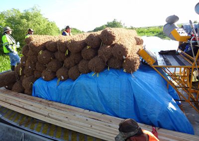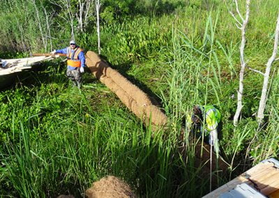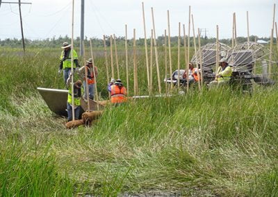 Case Study 2: – Remediation of Marsh Buggy Damage to Wetlands – Jean Lafitte Project – Coconut Husk and Pine Stake Remediation Materials On Site – MTT Super Turbine Airboat – www.marineturbine.com