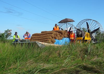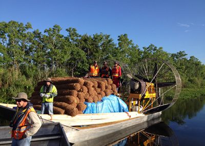 Case Study 2: – Remediation of Marsh Buggy Damage to Wetlands – Jean Lafitte Project – Coconut Husk and Pine Stake Remediation Materials – MTT Super Turbine Airboat – www.marineturbine.com